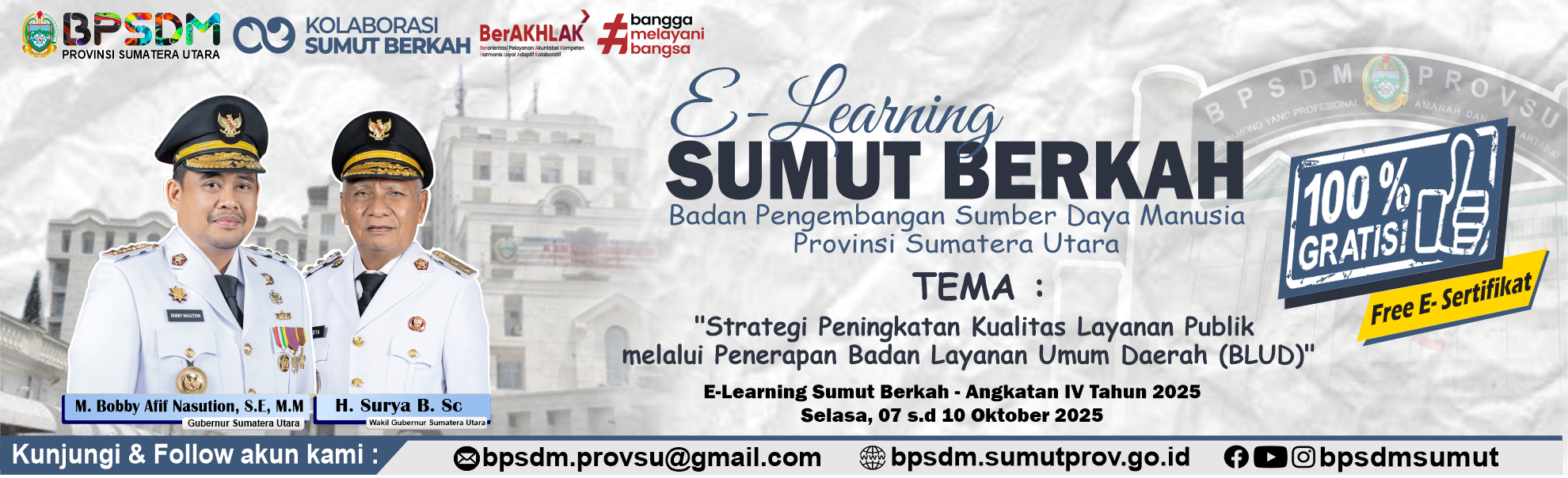 Badan Pengembangan Sumber Daya Manusia Provinsi Sumatera Utara, dalam melaksanakan fungsi dan perannya memiliki tanggung jawab meningkatkan kompetensi dan profesionalisme sumber daya aparatur dengan menyelenggarakan berbagai program dan kegiatan kediklatan melalui e-diklat teknis, fungsional, maupun Kepemimpinan. Harapan kami, keberadaan Website ini membuka akses informasi yang lebih luas serta sebagai sarana komunikasi yang saling membangun, khususnya di bidang peningkatan kompetensi pegawai.