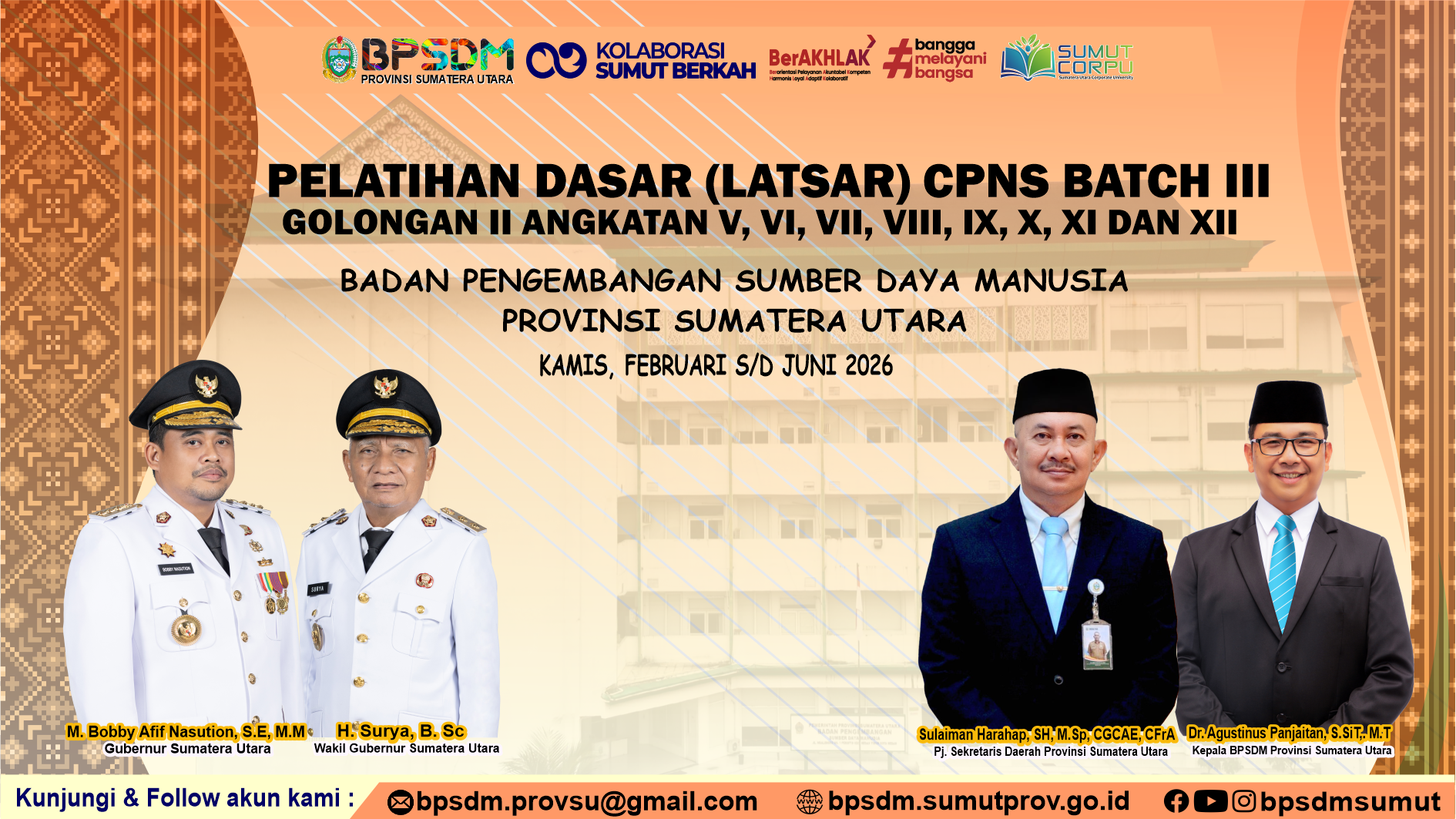 BPSDM Provinsi Sumatera Utara kembali menyelenggarakan Pelatihan Dasar (Latsar) CPNS Batch IV Golongan III Angkatan XIII–XV....