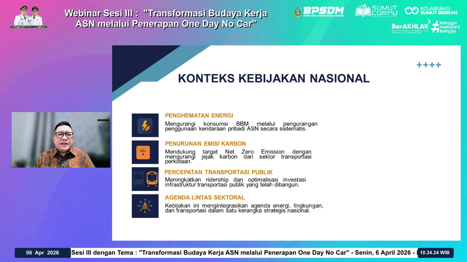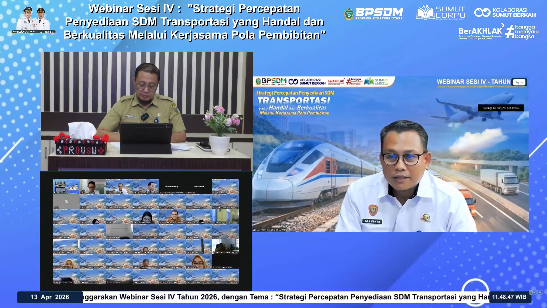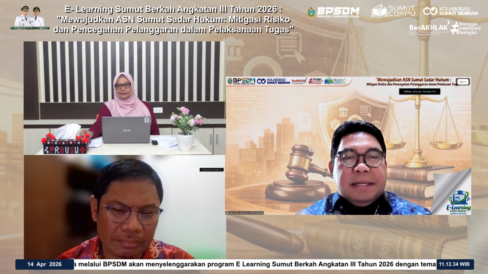 BPSDM Provinsi Sumatera Utara menggelar Webinar Sesi I Tahun 2026 yang dibuka secara resmi oleh Kepala BPSDM Provinsi Sumatera Utara pada 24 Februari 2026. Kegiatan ini diikuti oleh lebih dari 1.000 Aparatur Sipil Negara (ASN) se-Sumatera Utara melalui Zoom Meeting.